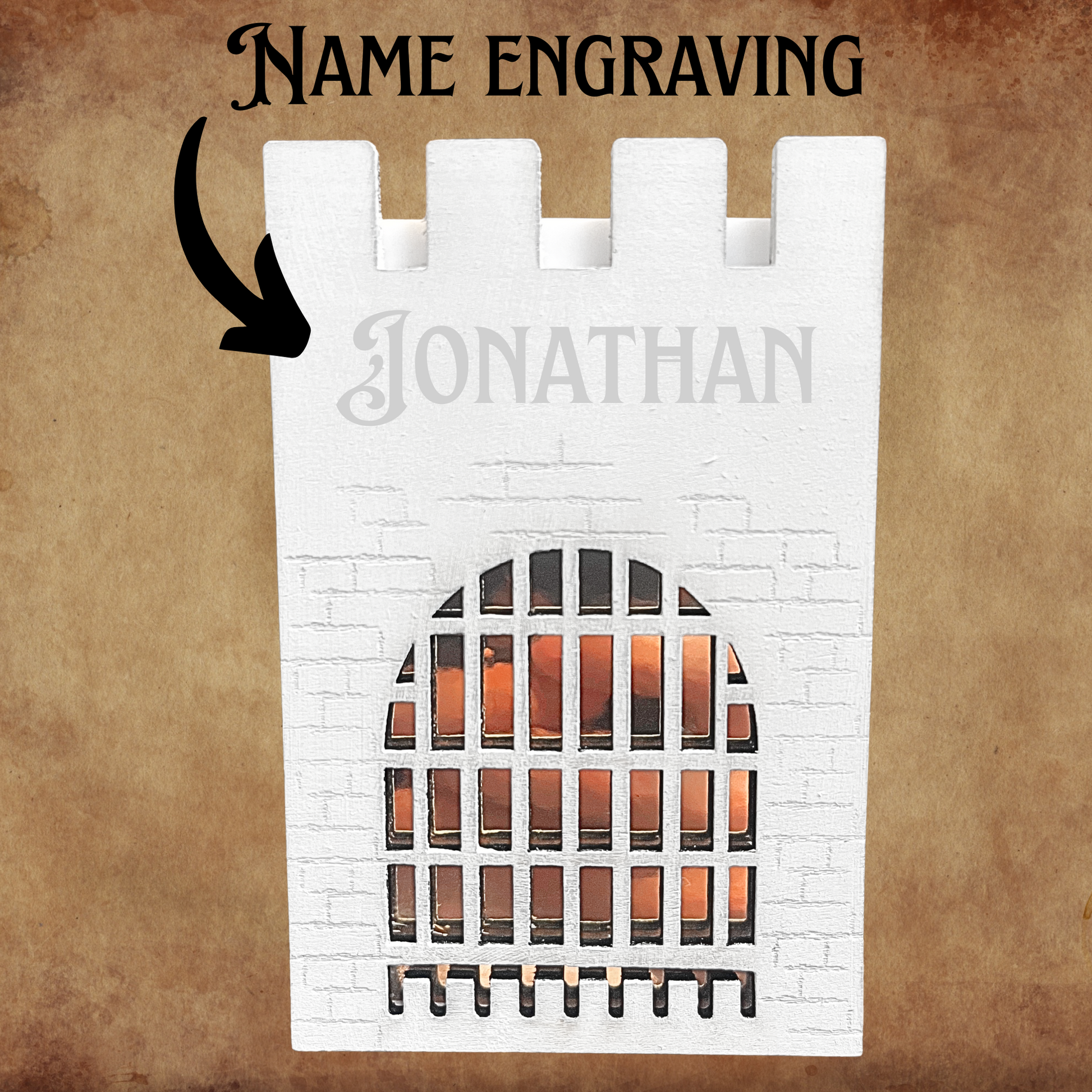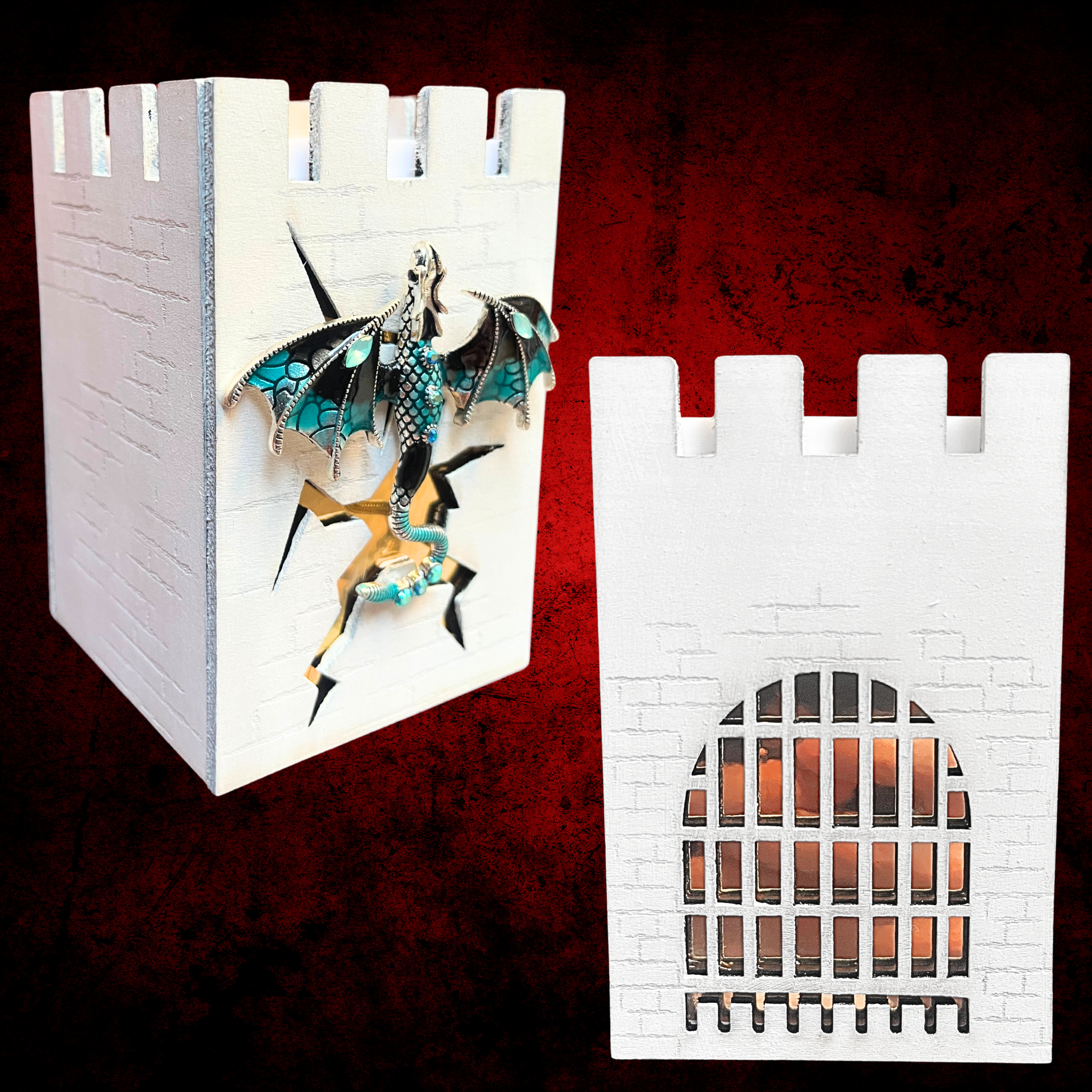 Bring fantasy magic to your workspace with this handmade White Castle Desk Organizer, featuring a 3D dragon bursting through engraved stone walls. Perfect for pens, pencils, scissors, paintbrushes, or D&D dice.