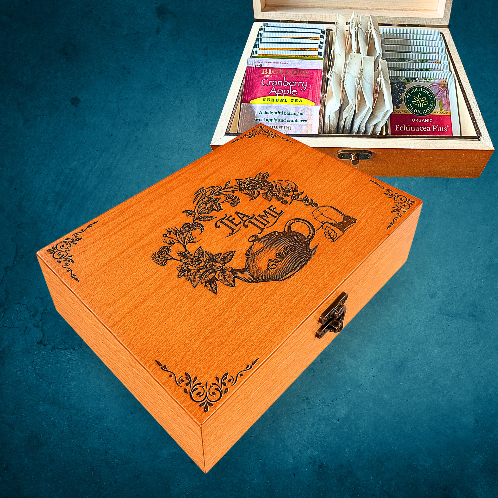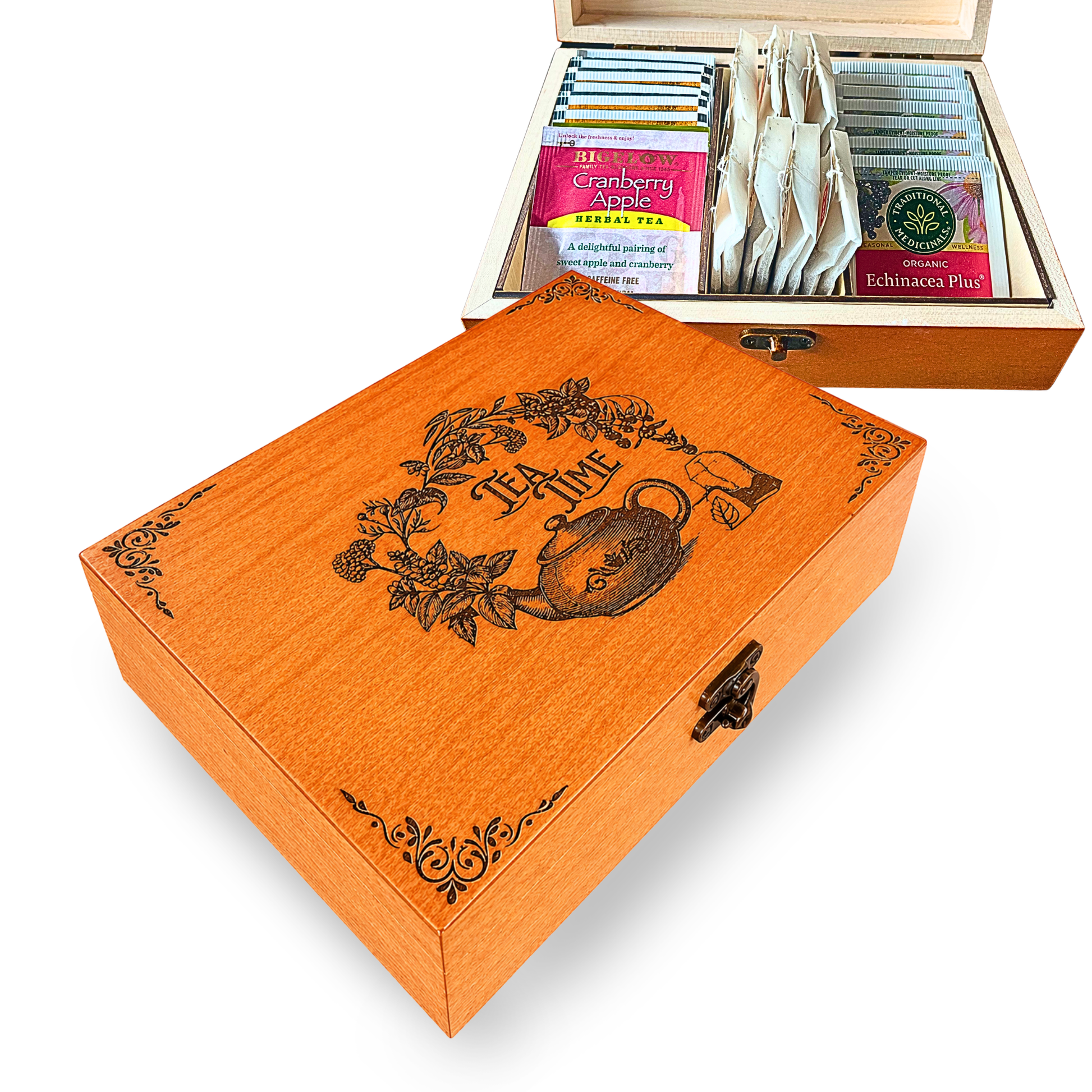 Crafted from natural wood and engraved with custom design options, this piece blends functionality with vintage charm—perfect for organizing your tea collection while adding a refined, classic touch to your space.